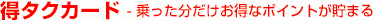 タクシーのぱんぷきんでは、清算時に得タクポイントカードを提示するだけで乗った分だけポイントが貯まる(ポイントは乗車料金100円につきの3ポイント)得タクポイントカードを始めました。(得タク公式サイトはこちら)